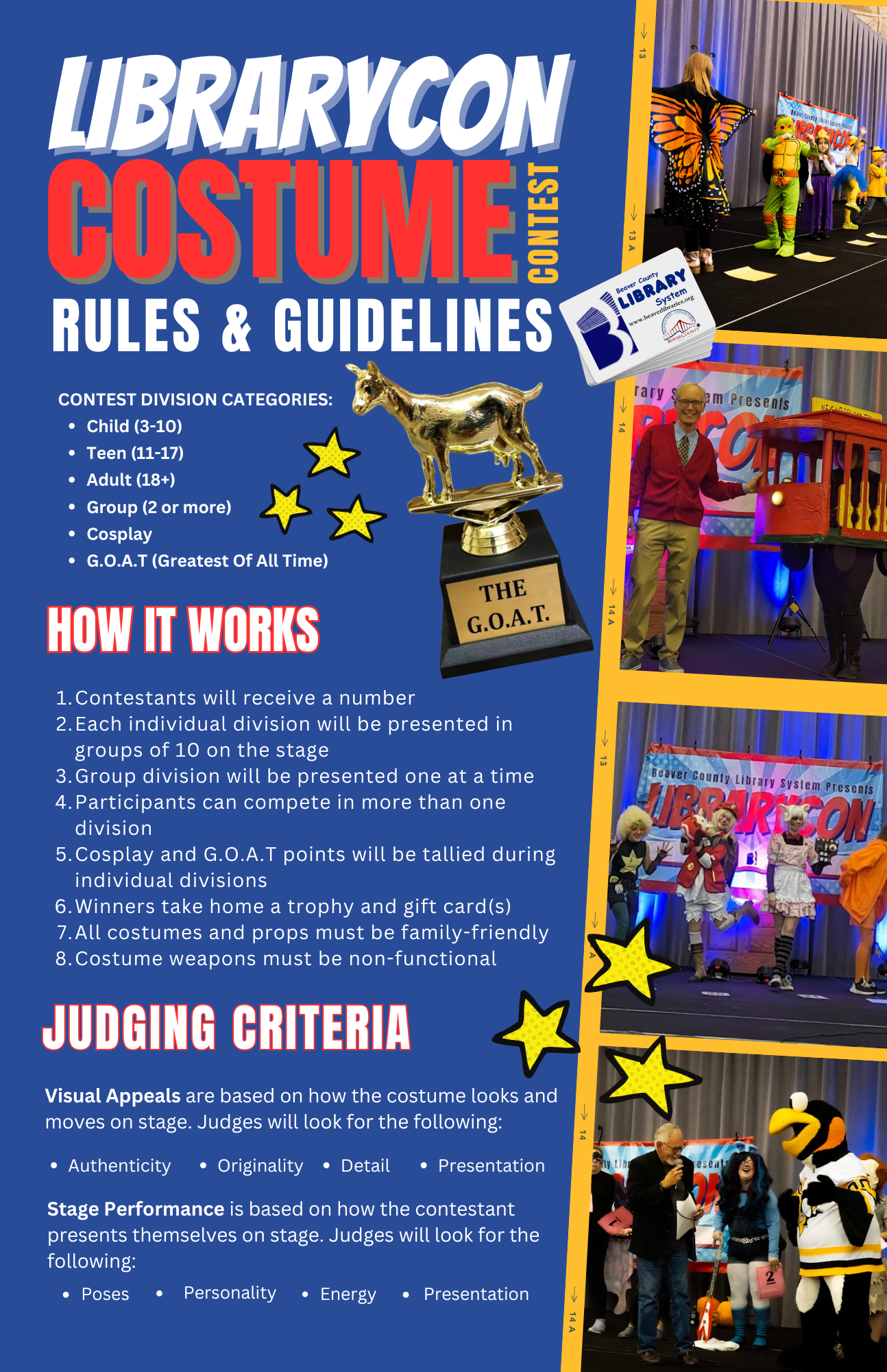 - To participate, visit the Costume Contest Table (located in front of the stage) to receive a number.