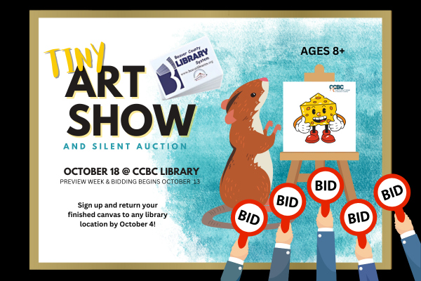 What is the Silent Auction? You may choose to donate your canvas to the Beaver County Library System by checking the donation option on the registration form. All proceeds from donated pieces help support and sustain the tinyART show program. Bidding begins during preview week, October 13-17 during regular college library hours. Final bids will be accepted through the end of LibraryCon, Saturday October 18 at 3:00pm.