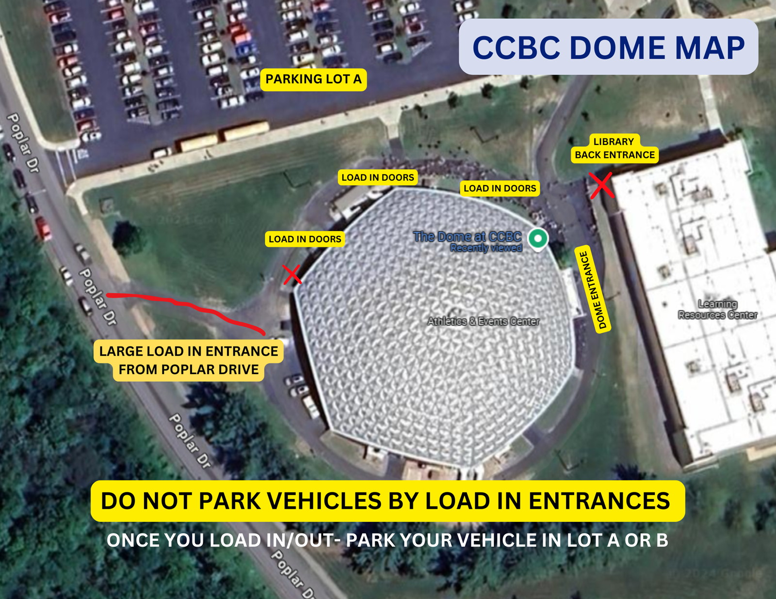 If you need easier access into the Dome with your set-up, use the Poplar Drive entrance located to the rear of the facility.